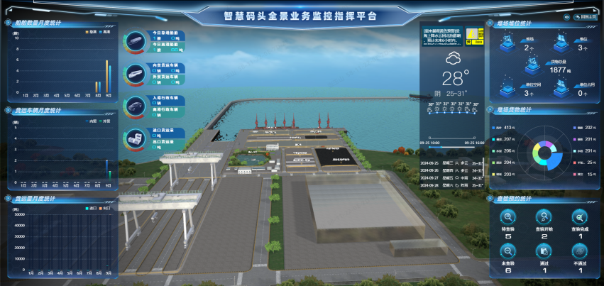 航通智能主要承擔(dān)信息化系統(tǒng)包括海關(guān)、邊檢、海事信息化系統(tǒng)相應(yīng)軟硬件設(shè)施設(shè)備,以及符合海關(guān)監(jiān)管要求和前詹作業(yè)區(qū)通用碼頭業(yè)務(wù)發(fā)展需要的聯(lián)網(wǎng)監(jiān)管平臺(tái)及配套系統(tǒng)。公司對(duì)標(biāo)全國(guó)一流碼頭作業(yè)區(qū)口岸基礎(chǔ)設(shè)施信息化建設(shè)標(biāo)準(zhǔn),充分運(yùn)用物聯(lián)網(wǎng)、大數(shù)據(jù)、人工智能、數(shù)字孿生、3D模型等前沿科技,并引入智慧碼頭全景業(yè)務(wù)指揮監(jiān)控平臺(tái),通過(guò)平臺(tái)與碼頭作業(yè)系統(tǒng)對(duì)接,抽取碼頭內(nèi)外貿(mào)貨物的作業(yè)數(shù)據(jù),結(jié)合可視化智能大數(shù)據(jù)展示功能,實(shí)現(xiàn)獲取船舶抵錨、靠泊離港作業(yè)動(dòng)態(tài),并對(duì)內(nèi)外貿(mào)貨物進(jìn)出卡口、堆場(chǎng)存取、裝卸船等實(shí)時(shí)、動(dòng)態(tài)管理和全程監(jiān)控,全面提升碼頭作業(yè)全過(guò)程可視化監(jiān)管水平和查驗(yàn)全流程智能化管理。