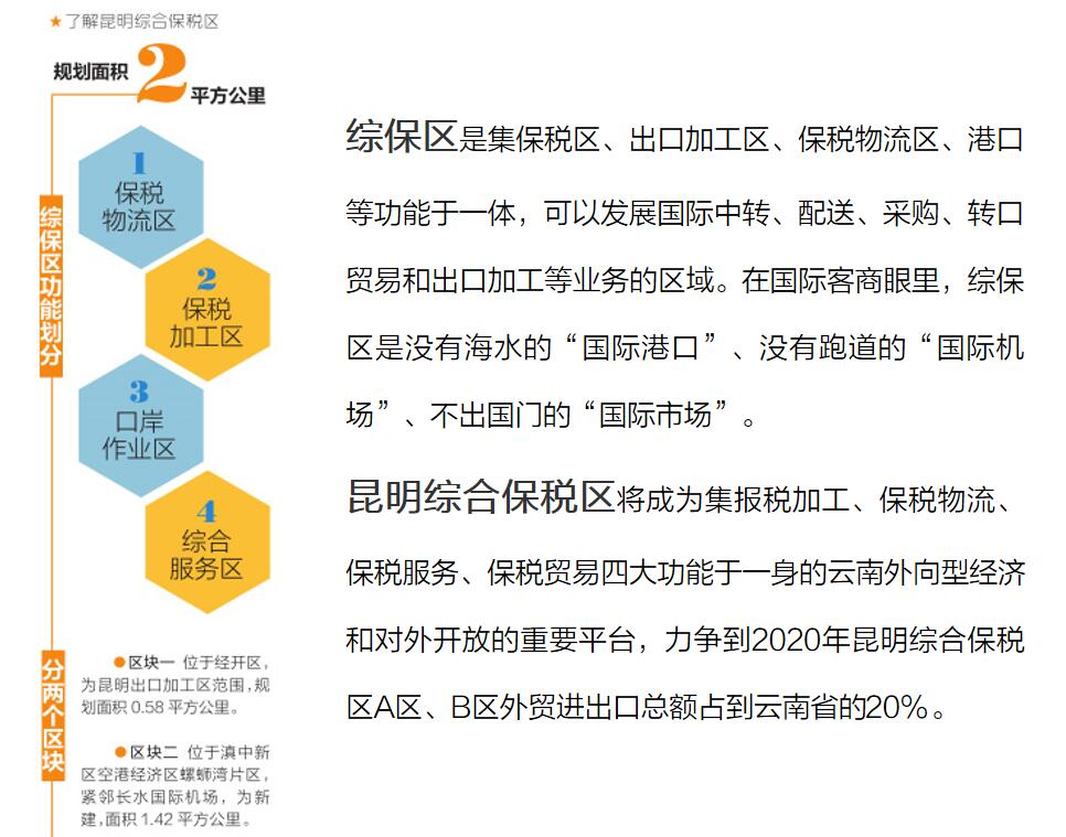 昆明將利用綜合保稅區(qū)這一特有的功能政策優(yōu)勢,積極與世界“對話”,積極聯(lián)通國內(nèi)國外“兩個市場”和“兩種資源”,集聚各類高端生產(chǎn)要素,把昆明打造成為面向西南開放的區(qū)域性國際貿(mào)易中心、物流樞紐中心、金融中心、信息中心、總部聚集中心、旅游文化中心和開放平臺,進(jìn)一步增強昆明面向南亞東南亞的影響力、輻射力、帶動力。