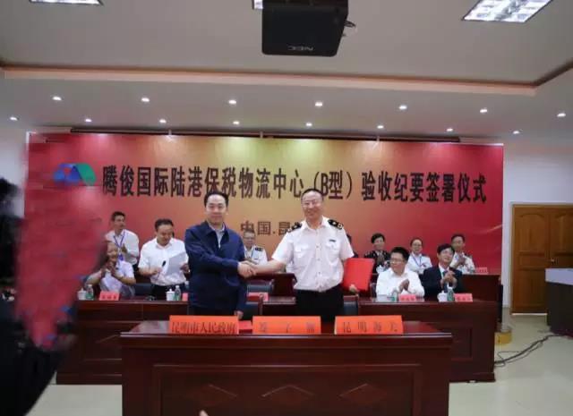 昆明海關(guān)副關(guān)長馬軍與昆明市人民政府副市長洪維智簽署了《騰俊國際陸港保稅物流中心基礎(chǔ)和監(jiān)管設(shè)施驗(yàn)收紀(jì)要》。昆明市人民政府高庚副秘書長、晉寧區(qū)人民政府李福軍區(qū)長、昆明市商務(wù)和投資促進(jìn)局徐增雄局長、及省、市、區(qū)各級(jí)有關(guān)部門負(fù)責(zé)人參加了驗(yàn)收工作。